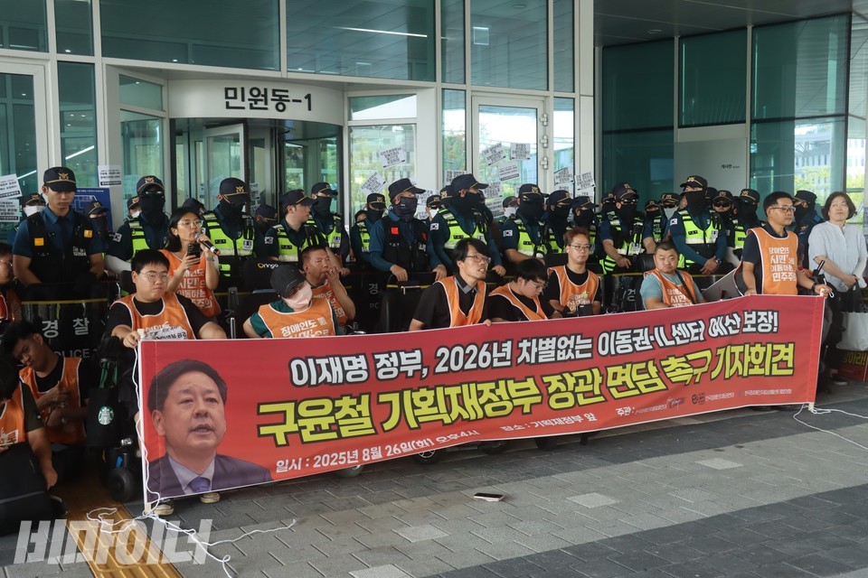이날 농성은 기재부의 ‘무응답’에서 비롯됐다. 박미주 전장연 정책국장에 따르면 기재부 국토교통예산과와 복지예산과는 오후 4시 기자회견 직전까지 응답이 없었다. 이에 장애인들이 장애인권리예산 요구안을 제출하러 행안부 민원 1동에 방문했지만 출입을 저지당했다.