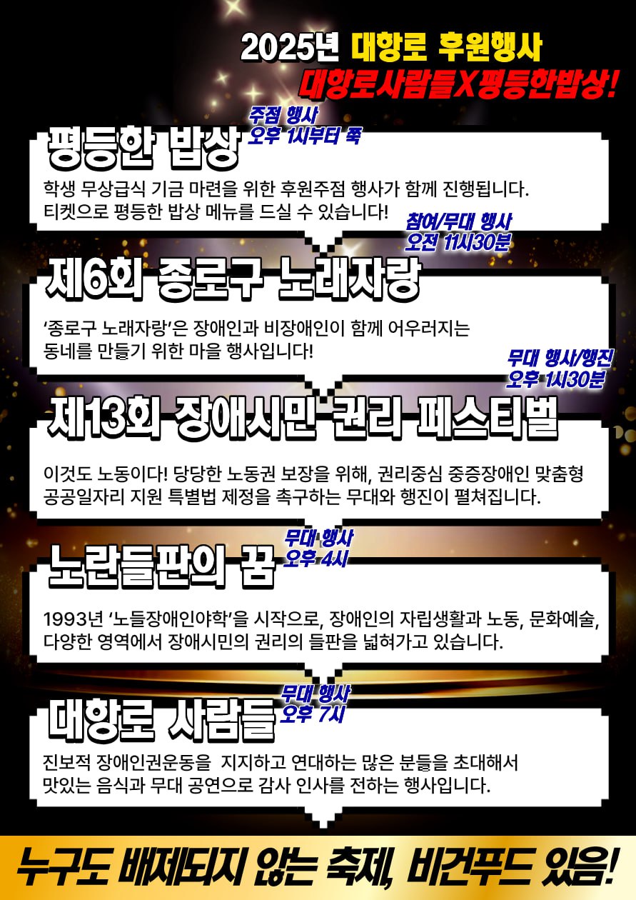 2025년 대항로 후원행사 ‘장애인도 시민으로 이동하는 민주주의’가 오는 19일 서울시 종로구 마로니에공원에서 열린다. 후원행사는 노들장애인야학 학생 무상급식 기금 마련을 위한 후원주점 ‘평등한 밥상’과 진보적 장애인운동단체들의 무대행사인 ‘대항로 사람들’ 등으로 구성된다.