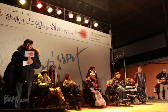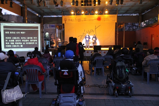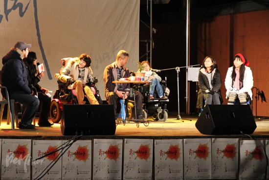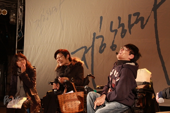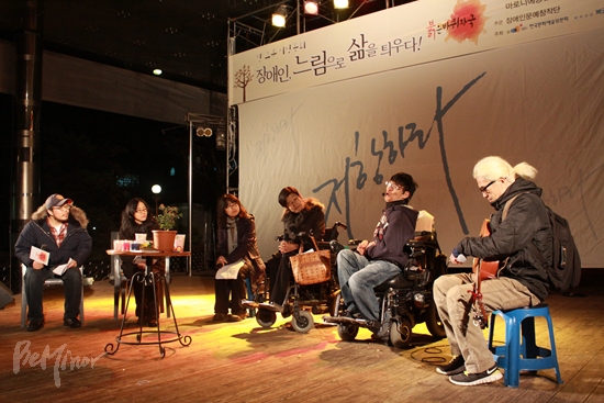 올해로 세 번째를 맞은 이번 시낭송회는 중증장애인 현장글쓰기모임 '글텍'에서 활동하는 회원들이 직접 자신의 시를 낭송했으며, 전국장애인차별철폐연대 몸짓패 바람, 장애인노래패 시선, 노동가수 박준과 이혜규, 시와, 다름아름 등의 노래 공연이 함께 펼쳐졌다. 이날 시낭송회의 이모저모를 사진에 담았다.