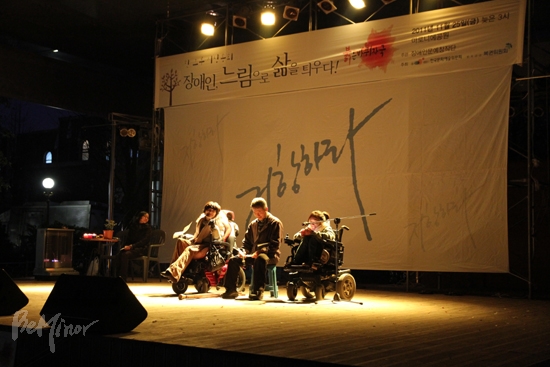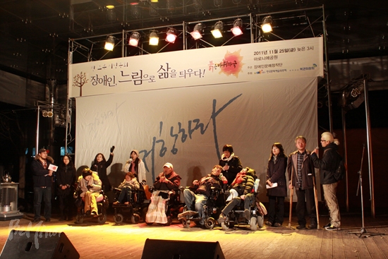 장애인문예창작단이 주관하는 '붉은 바퀴자국' 시낭송회가 25일 늦은 5시 대학로 마로니에공원에서 열렸다.