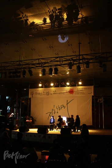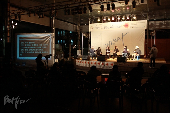 ![]() ▲사회자들과 글텍 회원, 민중가수 박준 씨가 무대에 올라 작품에 대한 이야기를 나누고 있다. |