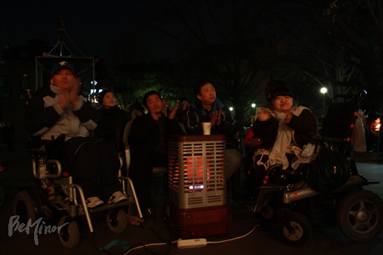 ![]() ▲관람석 곳곳에 놓인 난로 근처에서 추위를 녹이며 시낭송회에 함께하고 있는 사람들. |