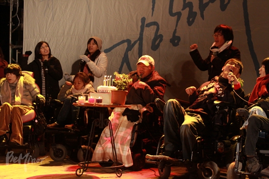![]() ▲사회자 '붉은 밍구' 씨가 이날이 20년 만에 탈시설한 김명학 씨의 생일임을 소개하고 있다. |
