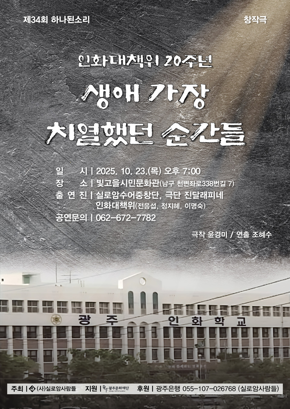 광주 인화학교 성폭력대책위원회(아래 인화대책위)의 20년 활동을 그린 창작극 ‘생애 가장 치열했던 순간들’이 무대에 오른다. ‘실로암사람들’은 오는 23일 오후 7시, 광주 빛고을시민문화관 공연장에서 ‘제34회 하나된소리’를 진행하며 무료로 공연을 선보인다.