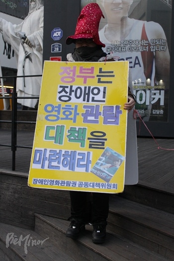23일 늦은 4시 대학로CGV 앞에서 올해 마지막 1인 시위 주자로 나선 고려사이버대학교 사회복지학과 윤현주(청각장애 1급) 씨는 '정부는 장애인 영화관람 대책을 마련해라'라고 쓰인 피켓을 들고 장애인영화관람권 마련을 촉구했다.