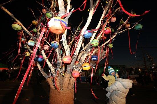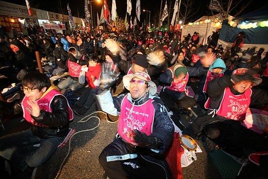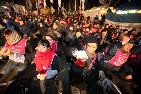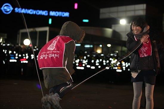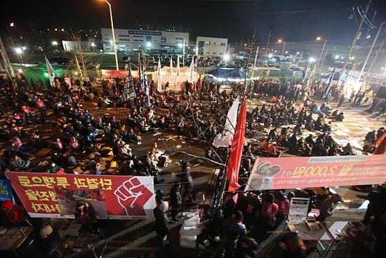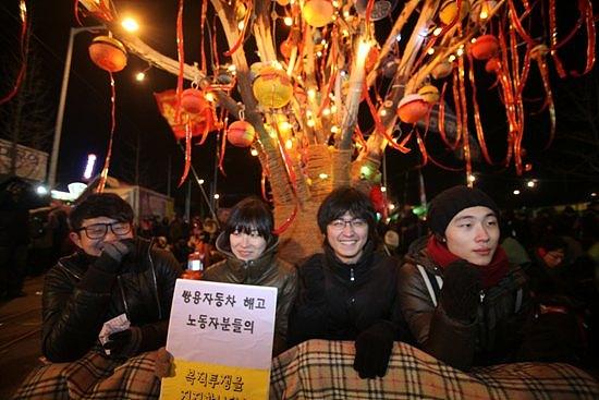 ▲1월 11일 쌍용차 공장 3차 포위의 날 희망의 소금꽃 나무에 불이 들어왔다.