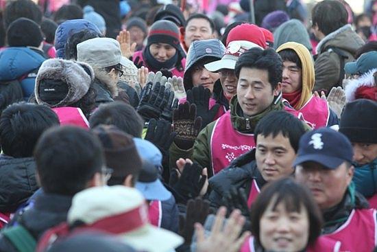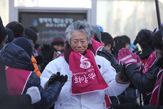 ▲11일 오후 2시 평택역 광장에서 간단한 집회를 끝낸 희망뚜벅이들이 하이파이브를