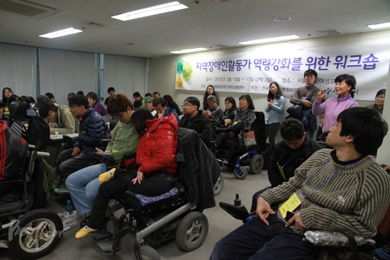 ![]() ▲김진숙 지도위원의 강연을 듣고 있는 장애인운동 활동가들. |