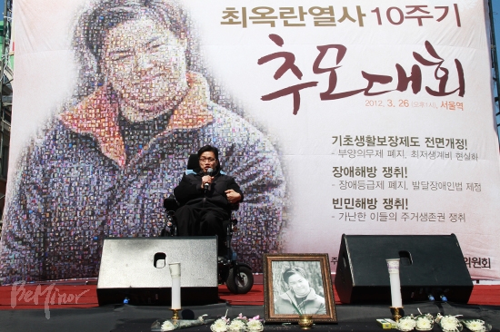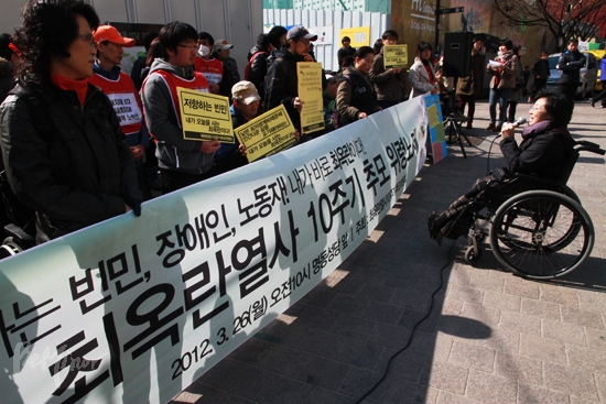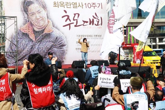 장애인, 여성, 노점상, 수급자로 살며 투쟁했던 최옥란 열사 10주기를 맞아 부양의무제 폐지와 최저생계비 현실화 등 기초생활보장제도 전면 개정을 촉구하는 10주기 추모대회가 26일 늦은 1시 서울역 광장에서 열렸다.