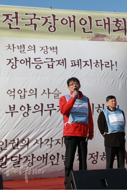 ![]() ▲전국장애인대회에서 여는 발언을 하고 있는 전국장애인차별철폐연대 박명애 상임공동대표. |