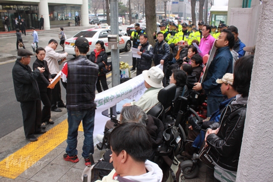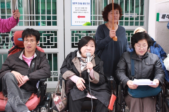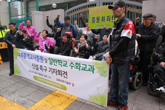 이에 420장애인차별철폐공동투쟁단(아래 420공투단)는 10일 늦은 1시 교육과학기술부(아래 교과부) 앞에서 수화통역교사 증원 및 일반학교 수화교과 신설을 위한 기자회견을 열고 교과부가 청각장애인 교육권 보장에 적극적으로 나서라고 촉구했다.