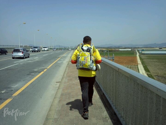 오늘부터는 겉잠바를 벗고 노란티를 받쳐입고 간다. 그동안 동행하던 피디들도 떠나고 이제는 균도랑 둘이서 손잡고 길을 간다. 진정으로 아빠와 함께 가는 세상걷기의 시작이다.