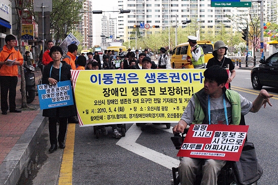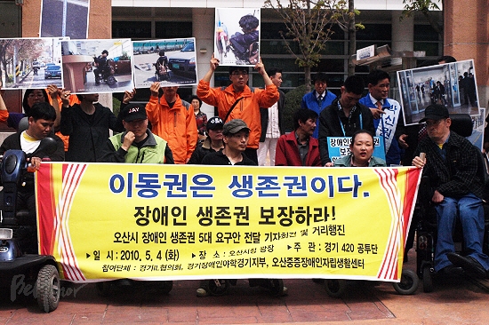 경기도 오산 지역 장애인들이 지역 내 장애인이동권 문제 등 자립생활 권리에 대해 이야기하기 시작했다. 오산장애인자립생활센터(아래 오산센터), 경기장애인자립생활센터협의회, 전국장애인야학협의회 경기지부는 4일 늦은 2시 오산시청 앞에서 기자회견을 열고 “앞으로 2010년 420경기장애인차별철폐공동투쟁단과 함께 장애인의 생존권 보장을 위하여 차별받지 않고 살아갈 오산지역 및 경기도를 만들기 위하여 오산지역장애인들의 생존 5대 요구안 쟁취를 위한 투쟁을 선언한다”고 밝혔다.