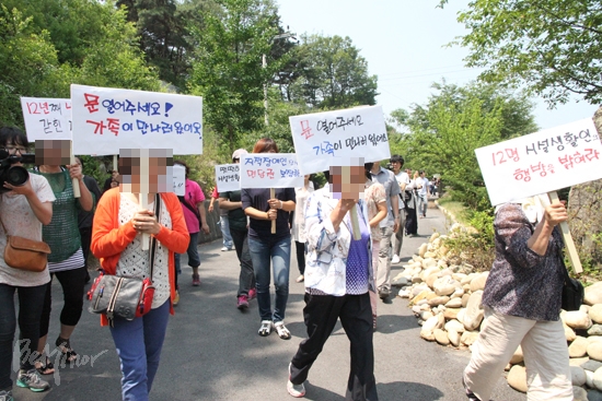 ▲가족들이 피켓을 들고 장 씨 집으로 향하고 있다.
