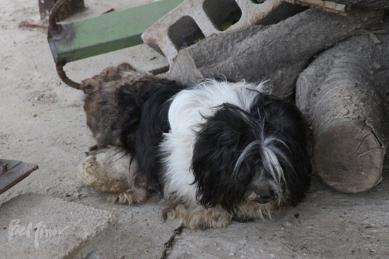 ▲장 씨 집 앞 계단에 있는 개. 상처인지, 살덩어리인지 알 수 없는 것이 허리에 달려 있다.