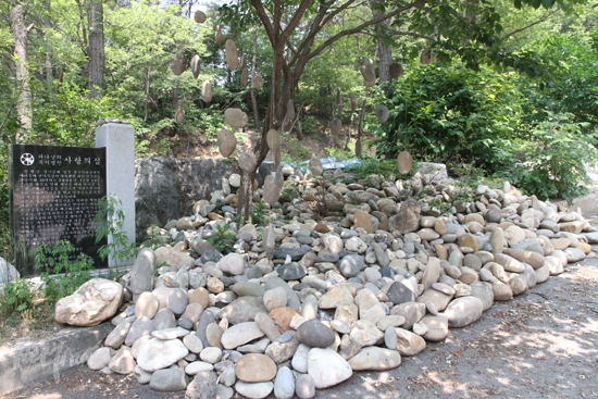 ▲장 씨 집 마당에 있는 돌무덤. 장 씨는 SBS 궁금한 이야기Y에서 이 돌무덤이 개 무덤을 만들어준 감사의 표시로 사료공장 측이 세워줬다고 밝혔다. 그러나 SBS 취재진 측이 사료공장에 문의한 결과 사료공장은 '그런 적이 없다'라고 답했다고 전했다. 장 씨 집 마당에는 이러한 돌무덤이 여러 개 있다. 그리고 그 위에는 수십 개의 돌에 구멍을 뚫어 나무에 매달아 놨다.
