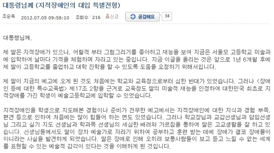 청와대 자유게시판에 지적장애가 있는 딸이 미술에 재능을 보여 예술고등학교에 진학했으나, 대부분의 대학이 특수교육대상자 특별전형에서 획일적으로 대학수학능력시험 지원자격 기준을 정해 지원조차 할 수 없다는 사연이 올라왔다.