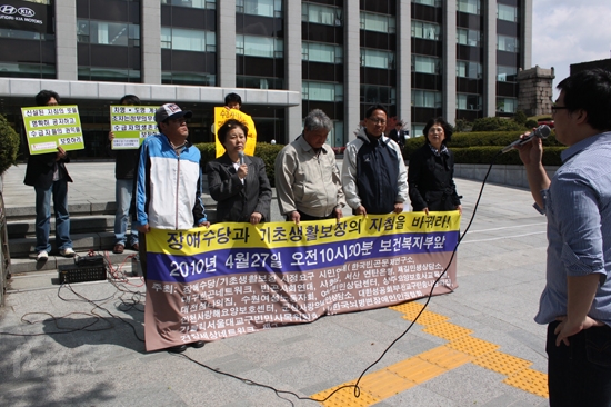 한국빈곤문제연구소, 한국뇌병변장애인인권협회(아래 한뇌협) 등 17개 단체로 구성된 '장애수당/기초생활보장 시정요구 시민연대'가 27일 이른 10시 30분 보건복지가족부 앞에서 기자회견을 열고 3급 장애인에게 중증장애수당과 장애인연금을 지급하고 인권을 침해하는 기초생활보장제도의 지침을 개정할 것을 촉구했다.