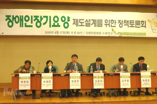 국회보건의료포럼(대표 한나라당 원희목 의원) 주최로 27일 이른 10시 국회의원회관에서 '장애인장기요양 제도설계를 위한 정책토론회'가 열렸다. 원희목 의원은 장애인에 대한 장기요양제도가 시급히 필요함에도 "아직까지 '장애인장기요양제도'에 대한 명칭, 대상자 선정, 급여의 종류, 재원확보방안 등 많은 부분에서 사회적 합의가 이루어지지 못한 상황"이라며 이번 토론회를 개최한다고 밝혔다.