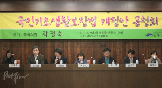 이에 민주노동당 곽정숙 의원은 지난 1월 공공부조의 사각지대를 없애고 수급자의 권리 보장을 강화하기 위한 국민기초생활보장법 일부개정법률안을 발의한 바 있다. 곽 의원은 16일 이른 10시 30분 국회도서관 소회의실에서 이 개정안에 대한 공청회를 열었다.