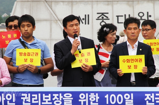 이날 기자회견에서 한국농아인협회 변승일 회장은 “농아인들에 대한 정보접근권이 보장되지 않아 농아인들은 노동권, 교육권, 참정권, 문화향유권 등에서 소외와 차별을 받는 어려운 상황에 처해 있고, 무엇보다 음성언어보다 수화가 열등하다고 보는 현실을 더는 용납하기 어렵다”라면서 “정보접근권을 보장하지 않는 것은 농아인을 살해하는 것과 마찬가지”라고 지적했다.