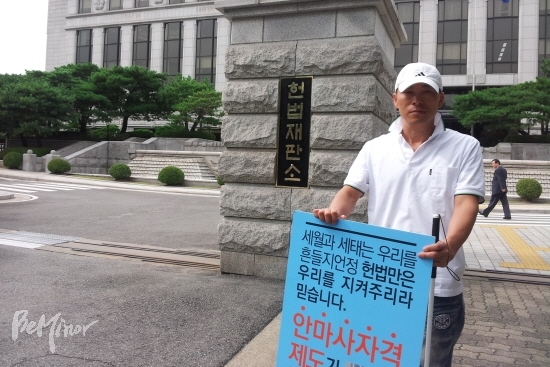 ![]() ▲헌법재판소에서 안마사자격제도 합헌을 촉구하며 1인 시위를 진행하고 있는 안마사 이승호 씨. |