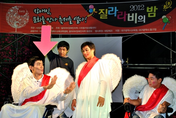 ![]() ▲직접 만든 동화로 연극을 하고 있다 - 검은 날개를 가진 요정과 흰 날개를 가진 요정 간의 갈등과 화합의 과정을 담은 동화는 날개의 빛깔로 요정과 요정이 아닌 것이 구별되지 않듯이 현실의 장애등급제로 사람들을 구분하는 것은 옳지 않다고 꼬집었다. |