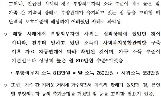 더구나 복지부는 딸 부부의 간주부양비가 56만 원으로 1인 최저생계비 55만 3354원보다 단지 7천 원 정도가 많아 아슬아슬하게 수급에서 탈락한 사례라는 내용은 밝히지 않았습니다. 오히려 '부양의무자의 소득 수준이 매우 높다는 점' 등과 같은 표현으로 적법하게 처리한 사례였다는 점을 강조했습니다.