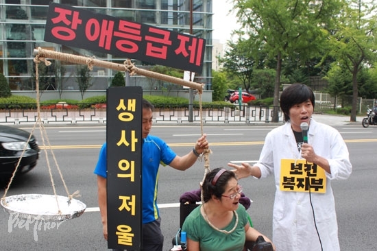 복지부도 장애인의 생존권 요구가 거세질 때마다 갖가지 무기를 사용해왔습니다. 그중 대표적인 것이 ‘의학적 기준’입니다. 의학적 기준은 객관이라는 외피를 쓰고 장애인의 요구를 짓누릅니다. 우리는 이미 장애등급제에서 의학적 기준이라는 것이 장애인의 삶과 얼마나 동떨어질 수 있는가를 목격한 바 있습니다. 제임스 본드와 다른 점이 있다면 복지부의 무기는 식상하다는 정도일 것입니다.