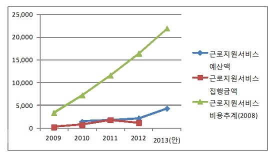 또한 2008년 국회 예산정책처의 자료를 보면, 본인부담금이 있더라도 근로지원서비스를 받겠다고 응답한 중증장애인노동자의 비율이 7.6%에 이르지만, 2013년 근로지원서비스 사업예산은 이러한 욕구를 충족시킬 수 있는 예산 추계액(219억 1200만 원)의 1/5수준(43억 5300만 원)에 머물렀다. 그나마 2013년 예산은 올해보다 약 2배가 증가한 액수이다.