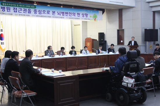 한국뇌병변장애인인권협회(아래 한뇌협)와 한국장애인단체총연맹 주최로 23일 늦은 2시 경기도의회 대강당에서 열린 ‘병원 접근성을 중심으로 본 뇌병변인의 현 상황’ 토론회에서 발제를 맡은 한뇌협 유흥주 회장은 “3년 전 경기도 화성으로 이주한 후 서울식 사고를 버려야 했다”라고 토로했다.