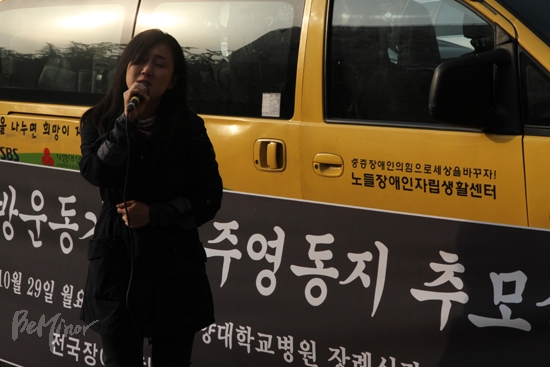 김 활동가는 “그녀와 동지들의 치열한 투쟁을 통해 그녀는 지난해부터 한 달 360시간, 하루 12시간꼴로 활동보조를 받을 수 있게 되었다”라면서 “하지만 24시간 활동보조가 보장되지 않는 상태에서 그녀의 자립생활은 여전히 목숨을 건 모험이었고, 2012년 10월 26일 새벽 활동보조가 없어 화재에 대피하지 못하고 방안에서 숨졌다”라고 전했다.