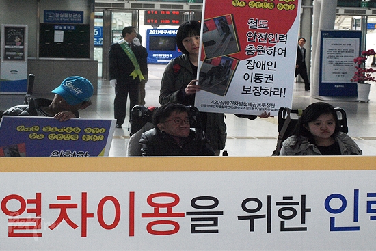이날 기자회견에서 420장애인차별철폐공동투쟁단 등은 한국철도공사에 ▲장애인의 안전한 이용을 위한 안전인력 확보 ▲관할 모든 역사의 엘리베이터 설치 등 교통 약자를 위한 이동편의시설 즉각 개선 ▲누리로 호와 KTX-2(산천)의 위험한 탑승설비 즉각 개선 및 안전 설비 마련 등을 촉구했다.