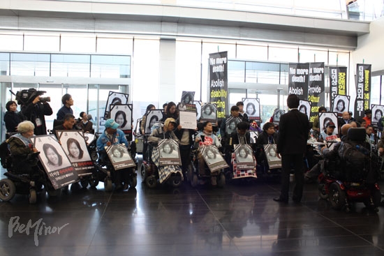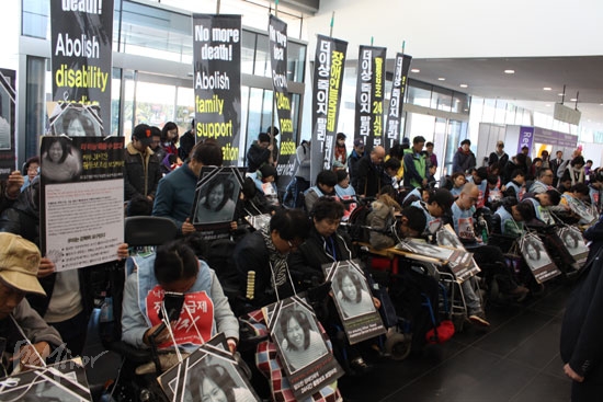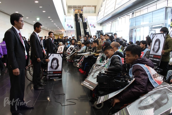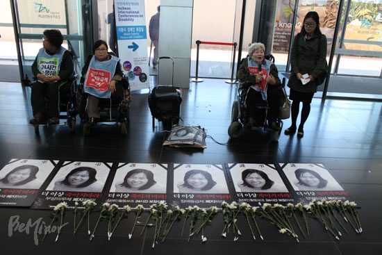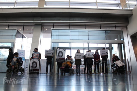 유엔 에스캅 정부 간 고위장관급회의가 열리는 송도 컨벤시아 1층 로비에서 11월 1일 늦은 1시 전국장애인차별철폐연대는 고 김주영 활동가의 죽음에 대해 보건복지부 임채민 장관의 사죄와 면담을 촉구했다.