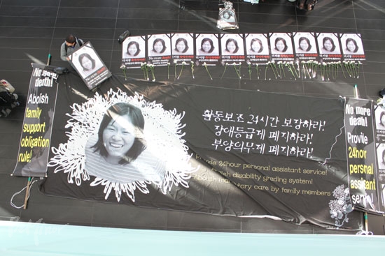 ![]() ▲"더 이상 죽이지 말라! 부양의무제 폐지하라!" 고 김주영 활동가 장례식 때 들었던 만장. |