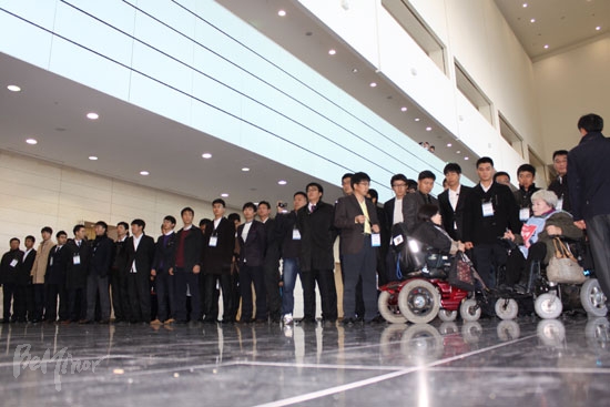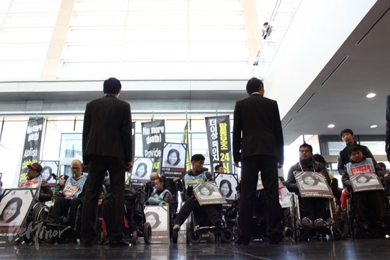 ![]() ▲한편 이날 이른 8시, 유엔 에스캅에 참석하는 국무총리와 복지부 장관을 만나기 위해 전장연 활동가 20여 명이 송도 컨벤시아 로비 1층에서 기다리고 있었으나 결국 만나진 못했다. |