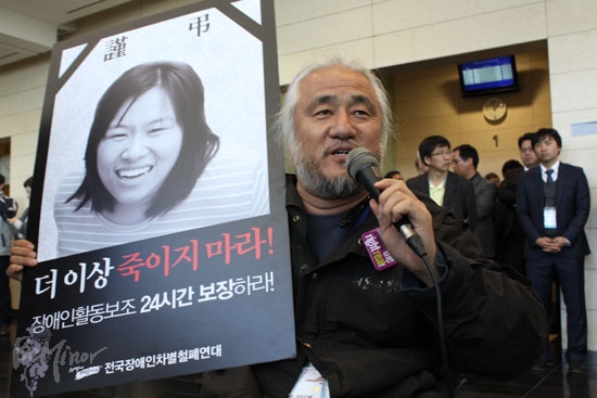 아슈라 대표는 “국제 장애인협약에서는 장애인의 살 권리, 보조받을 권리 등을 규정하고 있는데 한국정부는 어떻게 이런 지원조차 하지 않고 사람을 죽게 만들 수 있나”라고 성토하며 “살 권리를 보장하라”라고 외쳤다.