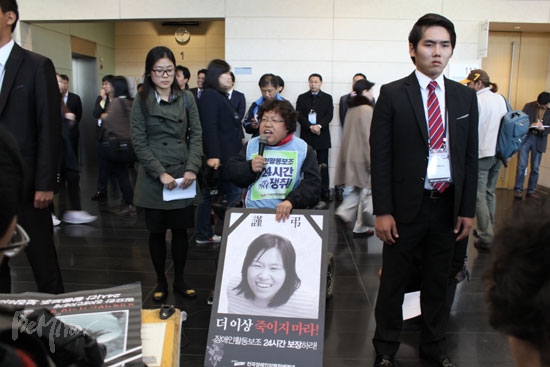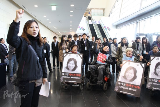 박김 사무국장은 “활동보조가 24시간 도입됐다면 불이 난 그날 밤, 활동보조인이 그녀를 도와 화염에서 나올 수 있었을 것”이라면서 “그런데 복지부 장관은 예산문제를 들어 사람을 죽여 놓고 지금 이 대회에서 국가보고서를 작성하고 있다. 그런 장관의 거짓된 보고를 오늘 우리가 낱낱이 알려주겠다.”라고 규탄했다.