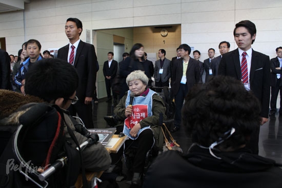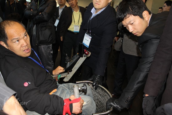 ![]() ▲주최 측이 전장연 활동가를 강제로 끌어내기 위해 휠체어를 붙잡고 있다. |