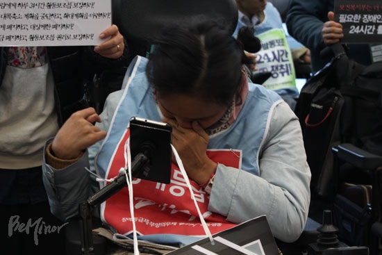 ![]() ▲장애인차별금지추진연대 박김영희 사무국장. 장례식 때 고 김주영 활동가 추모사를 쓰기도 했던 박김 사무국장은 고인을 기억하며 발언 도중 눈물을 보였다. |
