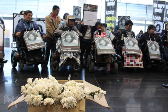![]() ▲유엔 에스캅 정부 간 고위장관급회의가 열리는 송도 컨벤시아 1층 로비에서 11월 1일 늦은 1시 전국장애인차별철폐연대는 고 김주영 활동가의 죽음에 대해 보건복지부 임채민 장관의 사죄 및 면담을 촉구했다. 기자회견 중 고인을 기리며 묵념하고 있다. |