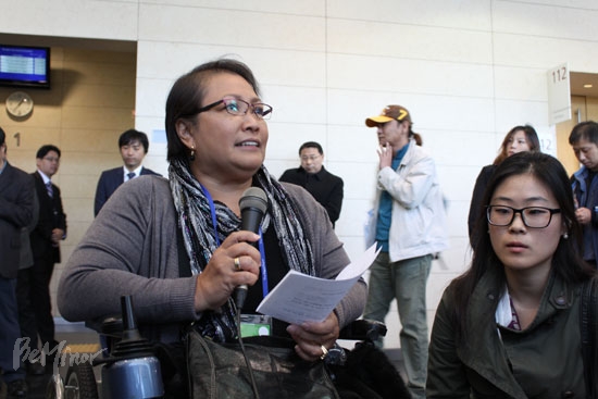 ![]() ▲방글라데시 여성장애인연합에서 활동하는 아슈라 대표가 고 김주영 활동가의 죽음에 관해 이야기를 듣고는 깊은 애도를 표하며 발언 도중 눈물짓고 있다. |