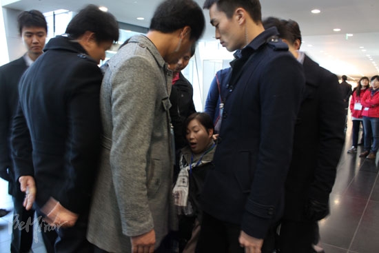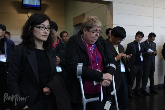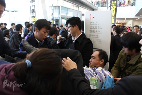 ![]() ▲2층으로 가는 엘리베이터를 막고 서 있는 주최 측. 유엔 에스캅 회의에 참석하려는 참석자 또한 주최 측에 막혀 올라가지 못해 헤매고 있다. |