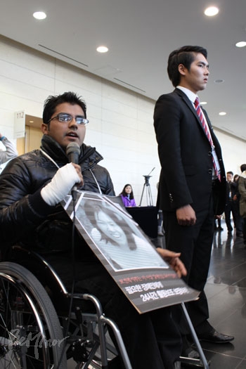 ![]() ▲장애청년국제인터십으로 한국에서 연수 중인 노레일 압바스가 고 김주영 활동가의 영정을 목에 걸고 발언하고 있다. 바로 옆에 주최 측 보안관이 경계하며 서 있다. |