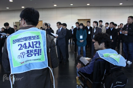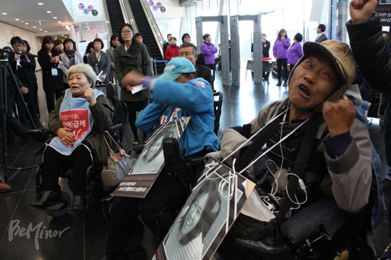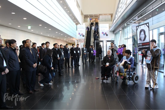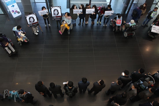 ![]() ▲유엔 에스캅에 참여하는 총리와 장관을 만나기 위해 송도 컨벤시아 로비 1층에서 기다리고 있는 전장연 활동가들. |