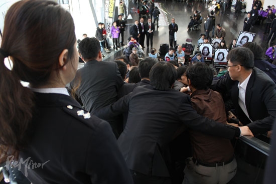 ![]() ▲1층에서 2층으로 올라오는 에스컬레이터를 막고 있는 주최 측과 고 김주영 활동가 분향소가 있는 2층으로 진입을 시도하는 전장연 활동가들. |