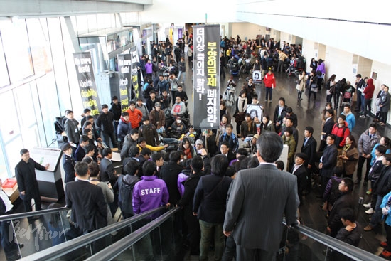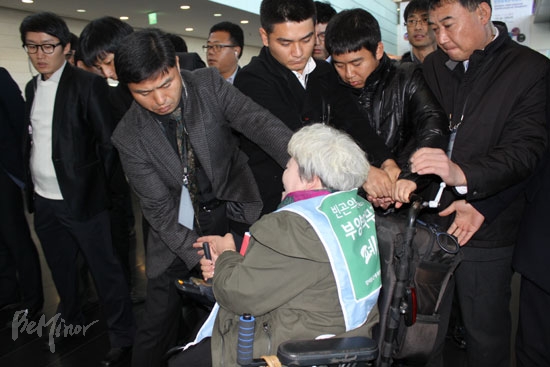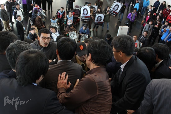 ![]() ▲엘리베이터 앞에서 대치하고 있는 장애인 활동가. 주최 측 요원이 장애인의 팔을 잡아서며 막고 있다. |