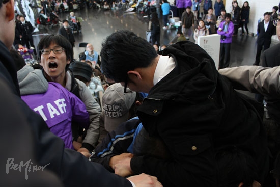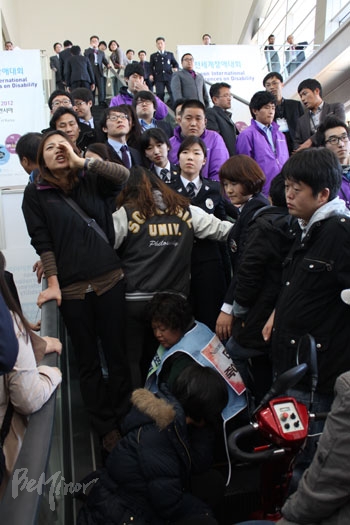 ![]() ▲2층 진입을 시도하며 중증장애인이 다른 활동가들에 들려 에스컬레이터 쪽으로 이동하고 있다. 이를 주최 측이 막아서고 있다. |