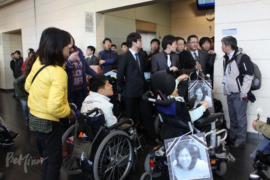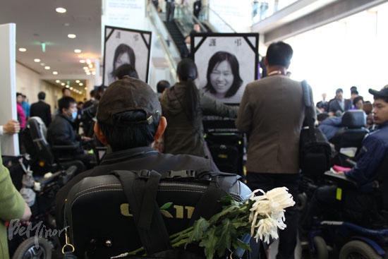 ![]() ▲2층 분향소에 올릴 국화꽃 한 송이를 휠체어에 꽂은 채 고 김주영 활동가의 영정을 바라보고 있는 휠체어 이용 장애인의 모습. 그러나 주최 측에 막혀 결국 2층 분향소에 올라가지 못했다. |
