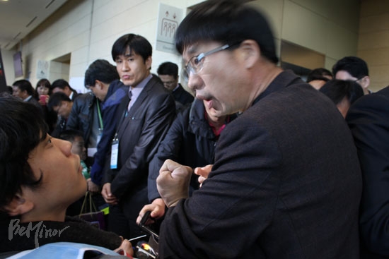 ![]() ▲보건복지부의 사죄 및 면담을 촉구하며 기자회견을 하는 모습. 바로 앞에서 주최 측이 막아서고 있다. |